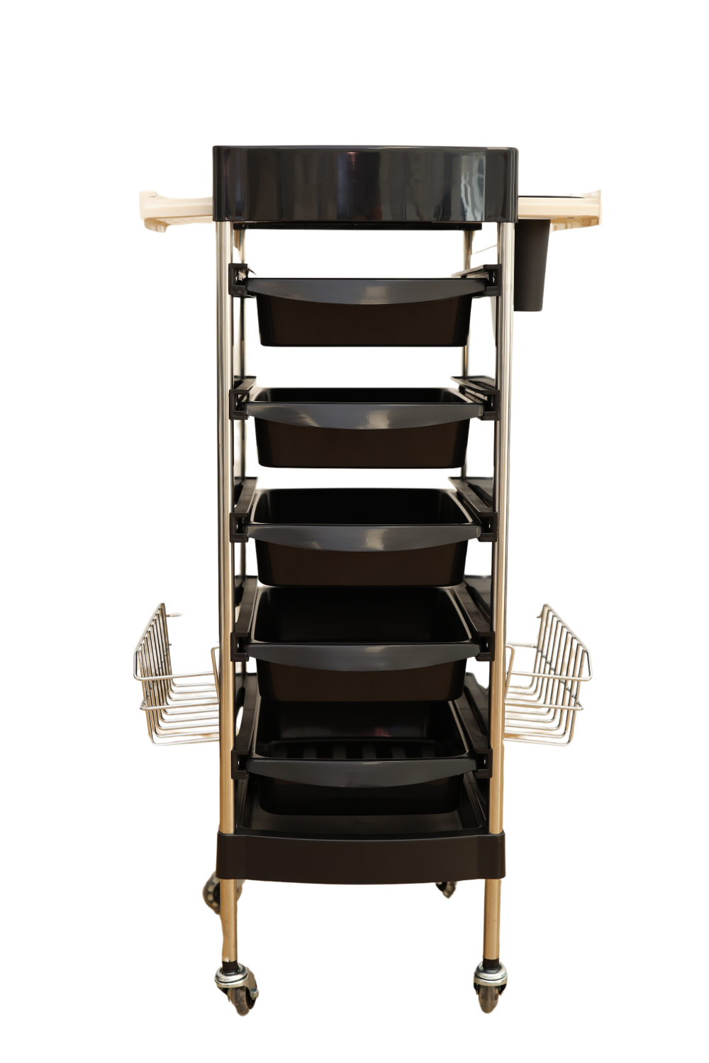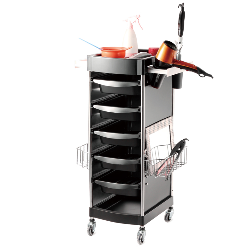 Zahvaljujući čvrstoj konstrukciji i pametno raspoređenim ladicama, ova kolica omogućuju uredno pohranjivanje alata, boja, četki i ostalog pribora, čime se olakšava svakodnevni rad u salonu. Kolica X11-6 imaju elegantnu crnu konstrukciju i pet funkcionalnih ladica koje omogućuju sistematizaciju pribora. Gornja površina dizajnirana je s dodatnim pretincima za čestu uporabu, dok čvrsti kotačići omogućuju lako i tiho premještanje unutar salona.