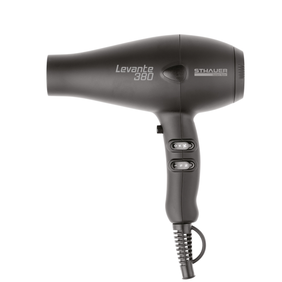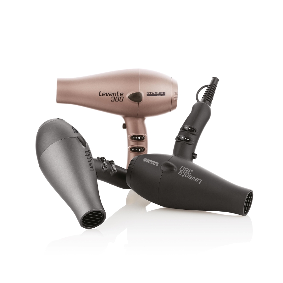 Profesionalni asortiman sušila za kosu Levante 380 osvaja i svojim oblikom i bojama. Savršen i za muške i za ženske frizerske salone, njegov ergonomski oblik osigurava pravu ravnotežu težine, što ga čini iznimno moćnim, ali i laganim alatom. Novi motor znači da se može koristiti dulje vrijeme u salonu, dok turmalinske ploče obložene keramikom osiguravaju kosu od oštećenja. Kraj cijevi odgovara svim univerzalnim mlaznicama.