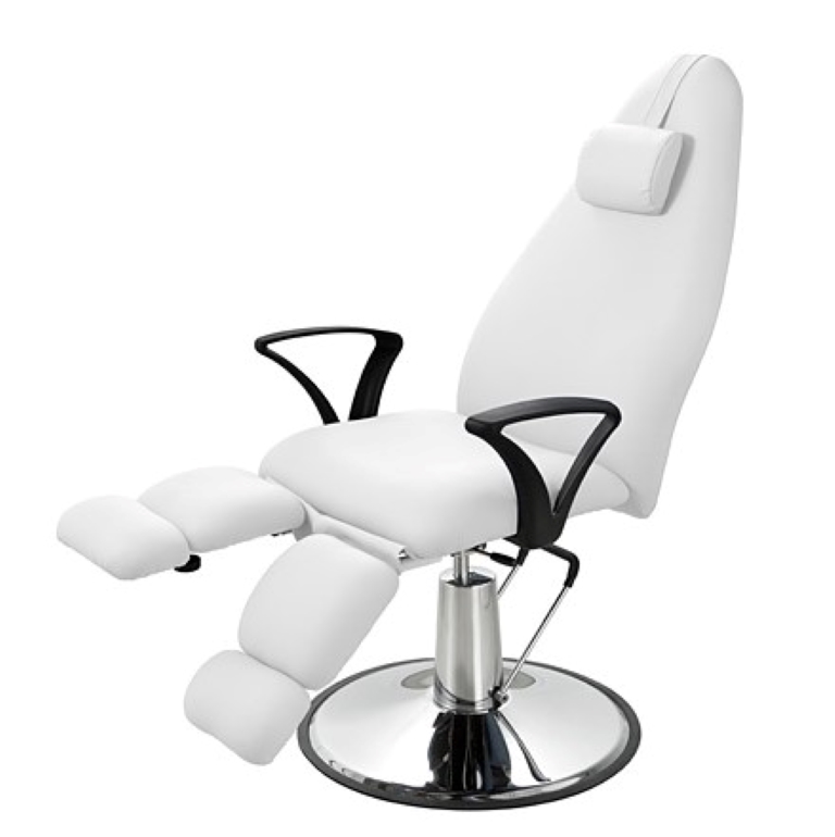 Rotirajući pedikerski stolac opremljen hidrauličnom pumpom koja kontrolira visinu. Naslon za leđa i noge neovisno se podešavaju plinskim dizalom. Bijela PU bešavna presvlaka visoke kvalitete koja olakšava čišćenje.