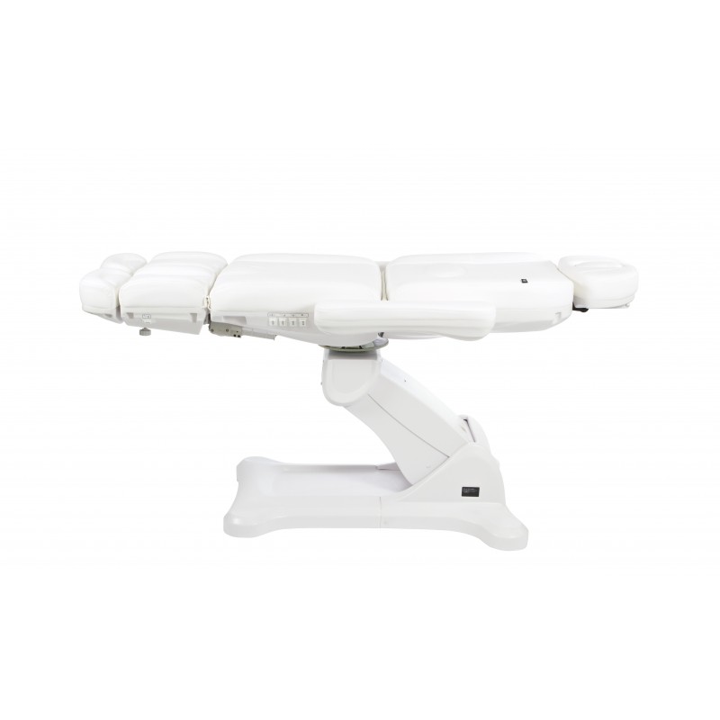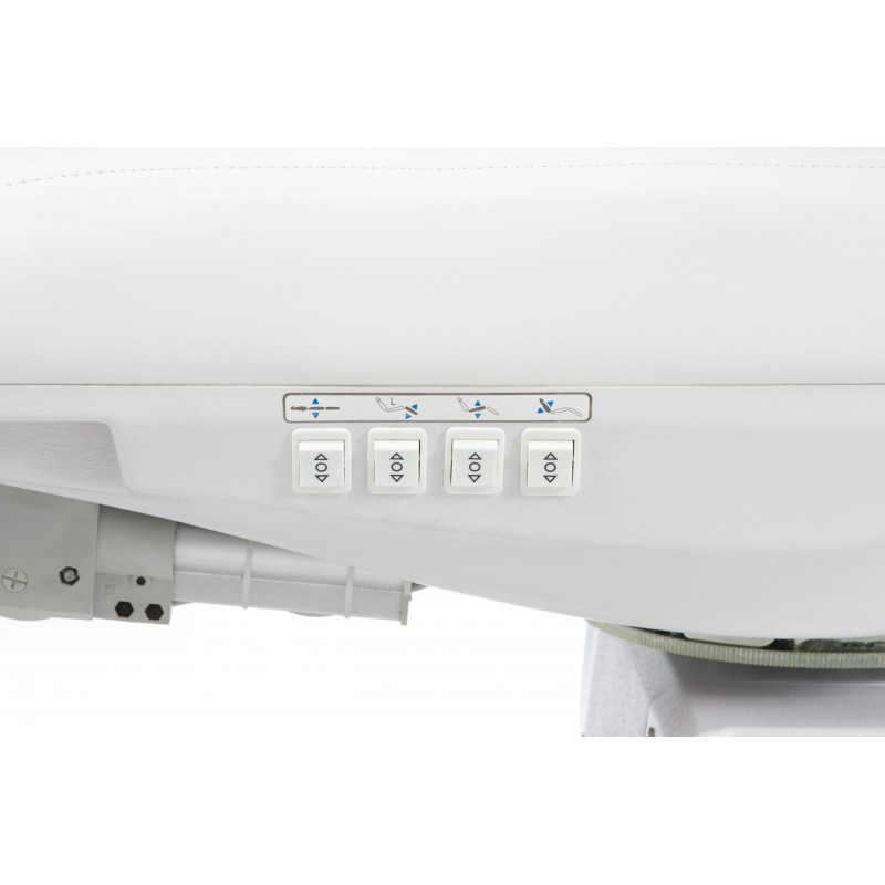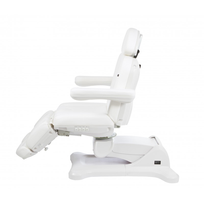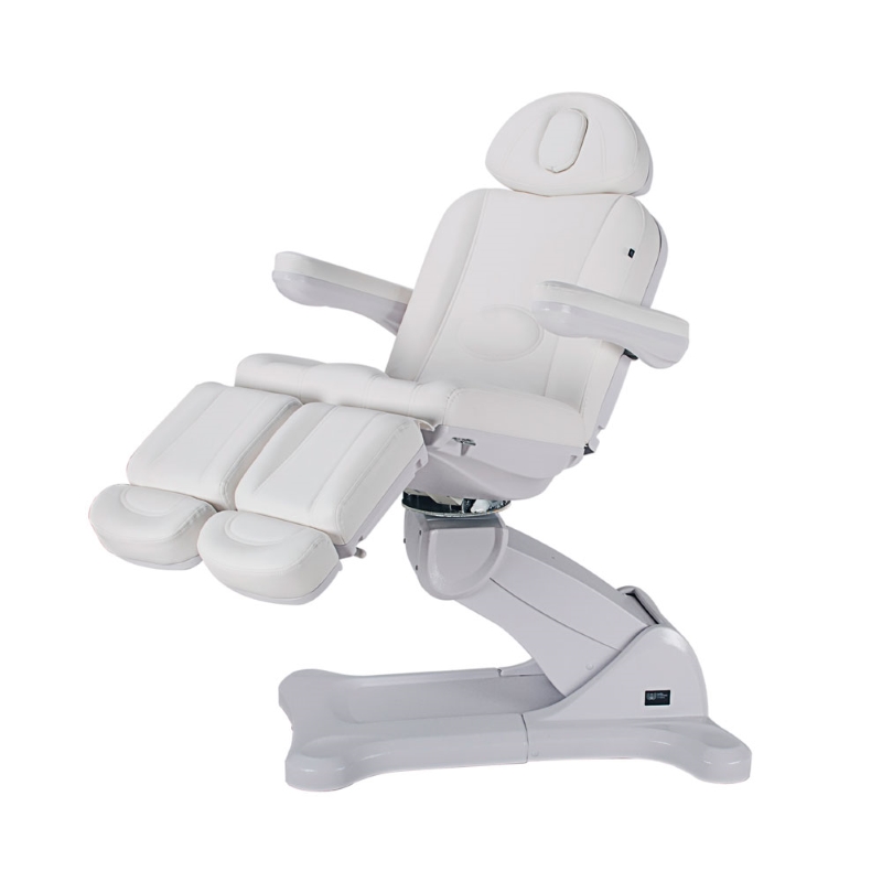 Vrhunski pedikerski stolac posebno osmišljen za optimizaciju radnog prostora zahvaljujući rotaciji od 240°. Opremljen s 5 motora koji omogućuju potpunu kontrolu svih funkcija s bilo koje točke stolice. Nasloni za ruke i podesivi naslon za glavu. Nasloni za noge podesivi po visini plinskim liftom.omogućuju potpunu kontrolu svih funkcija s bilo koje točke stolice. Ova verzija uključuje funkciju RESET za vraćanje stolca u nulti položaj. Bijela PU presvlaka visoke kvalitete koja olakšava čišćenje.